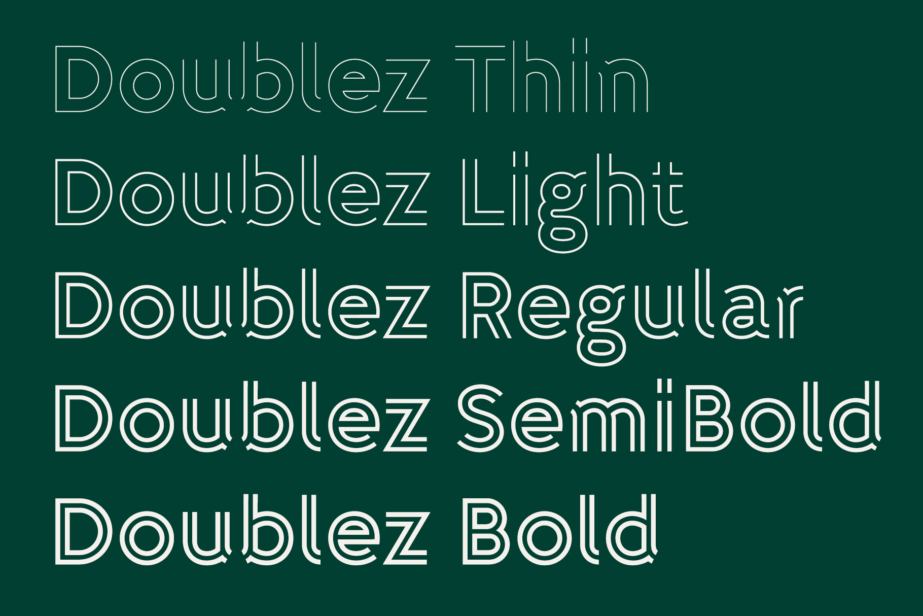 Doublez is a beautiful display typeface built from clean parallel lines, delivering a bold, geometric, and architectural character. The family includes full uppercase and lowercase sets in five weights: Thin, Light, Regular, Semibold, and Bold.